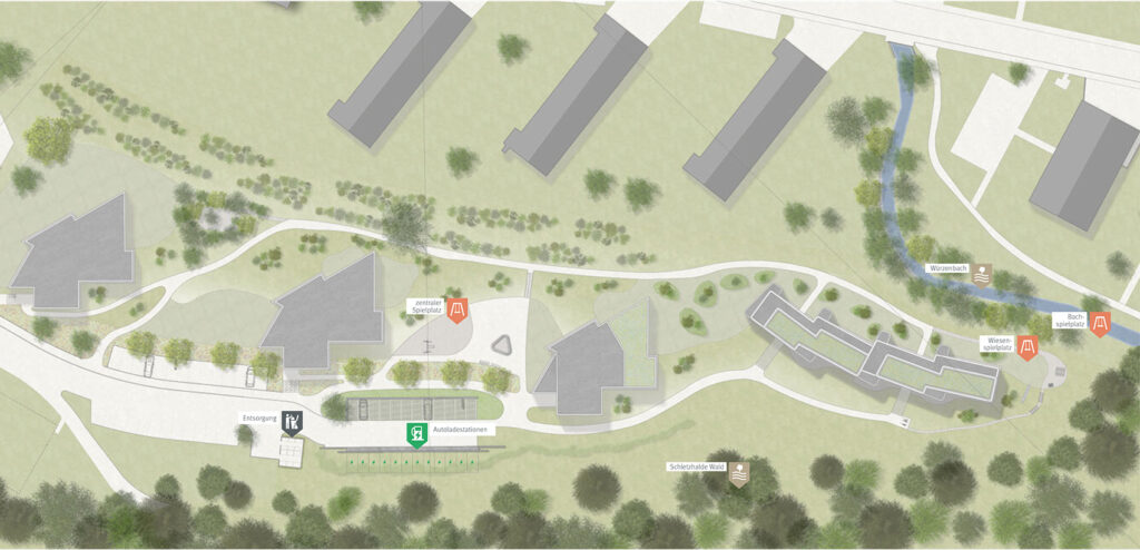 Gemeinschaftsräume bieten Ihnen die Möglichkeit, anderen Bewohnerinnen und Bewohnern zu be­gegnen. Der zentrale Begegnungsort mit Sandkasten, Schaukel und verschiedenen Sitzmöglichkeiten bildet das Zentrum der Überbauung. Dieser Platz soll eine Grundlage bilden, um das nach­barschaftliche Leben zu aktivieren und den Quartiercharakter zu stärken.